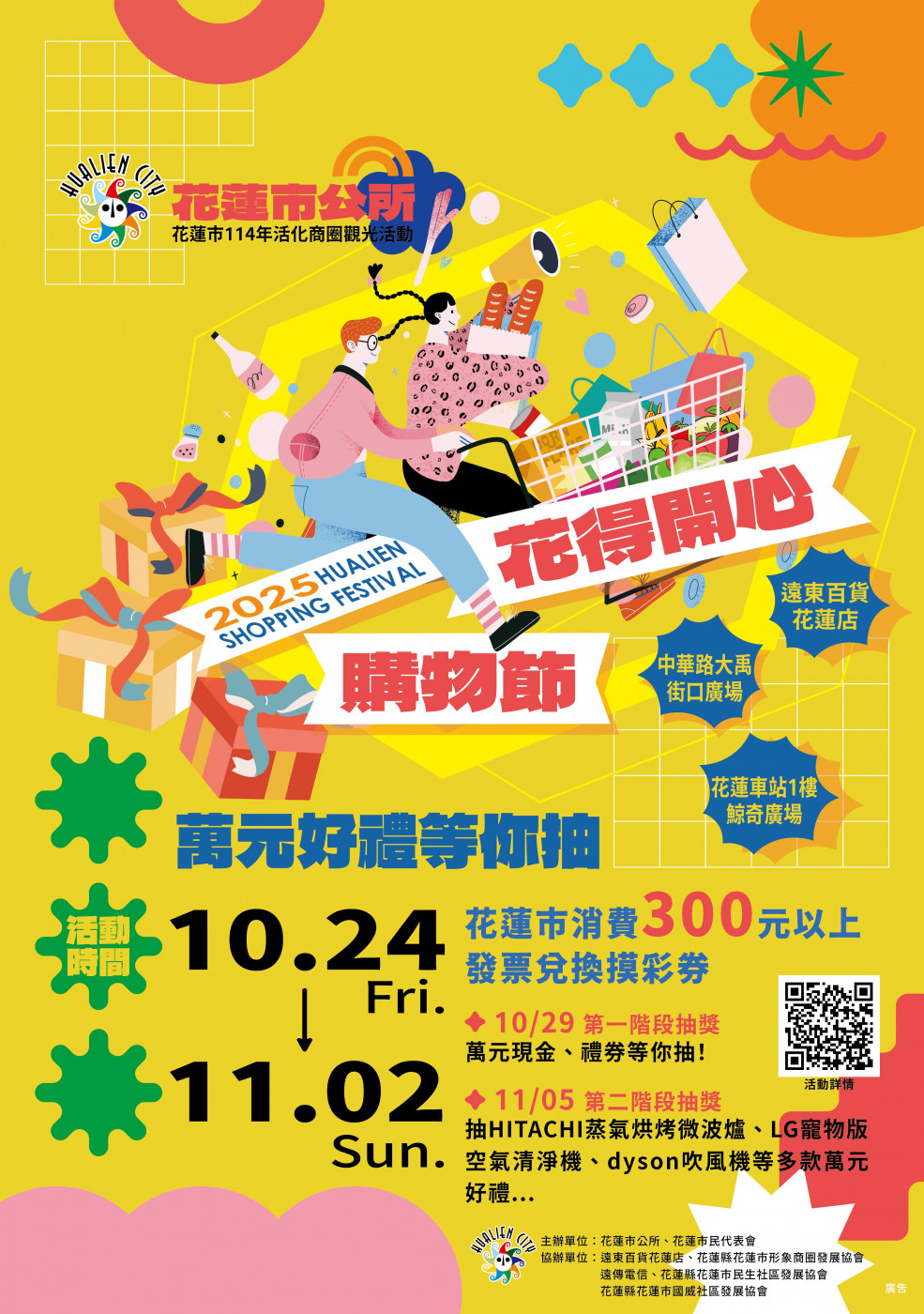一、 花蓮市辦理「花得開心購物節」活動,自114年10月1日起至114年11月2日止,祭出於花蓮市購物單筆消費300元以上發票,消費登錄即可兌換摸彩券,活動詳情請上官方網站https://reurl.cc/pYEd9l查詢。