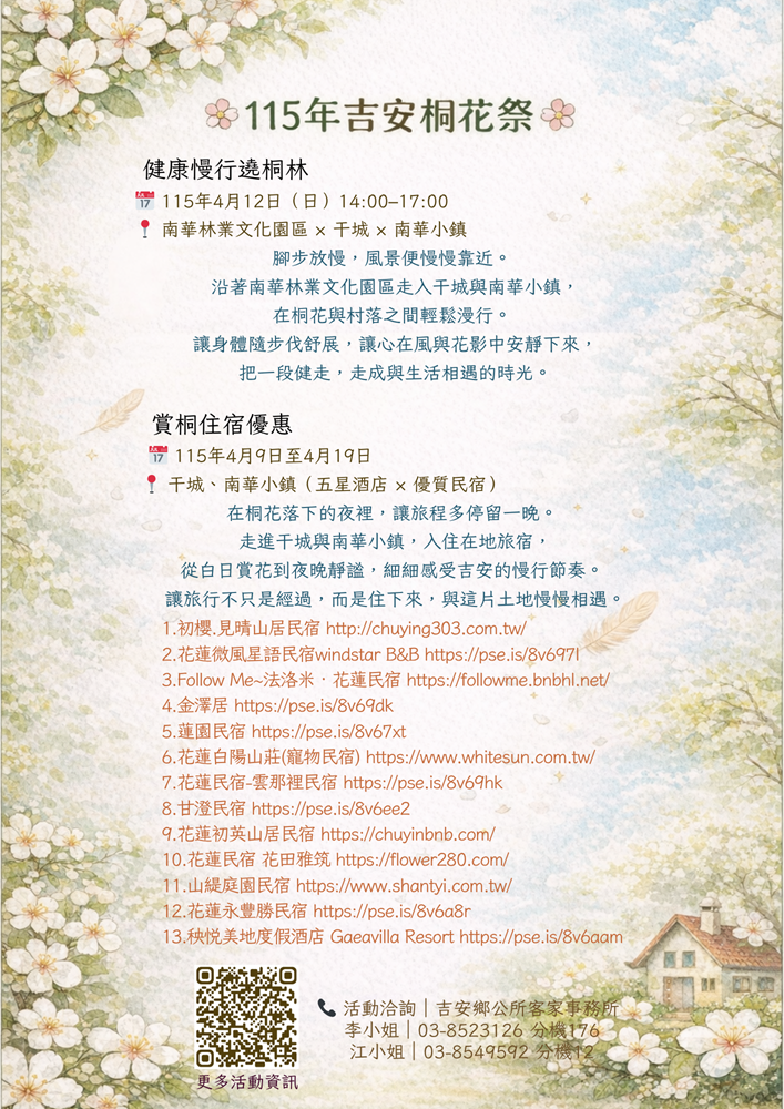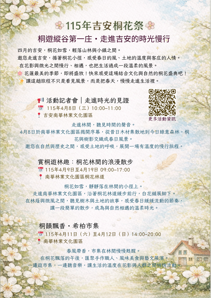一、花蓮縣吉安鄉公所為推廣該鄉客家文化藝術與自然景觀之美辦理「2026吉安桐花祭」系列活動,特別結合南華林業文化園區之歷史底蘊,透過慢行體驗、藝文市集與在地住宿優惠,引領民眾走進自然,感受土地與人文交織的時光慢行。